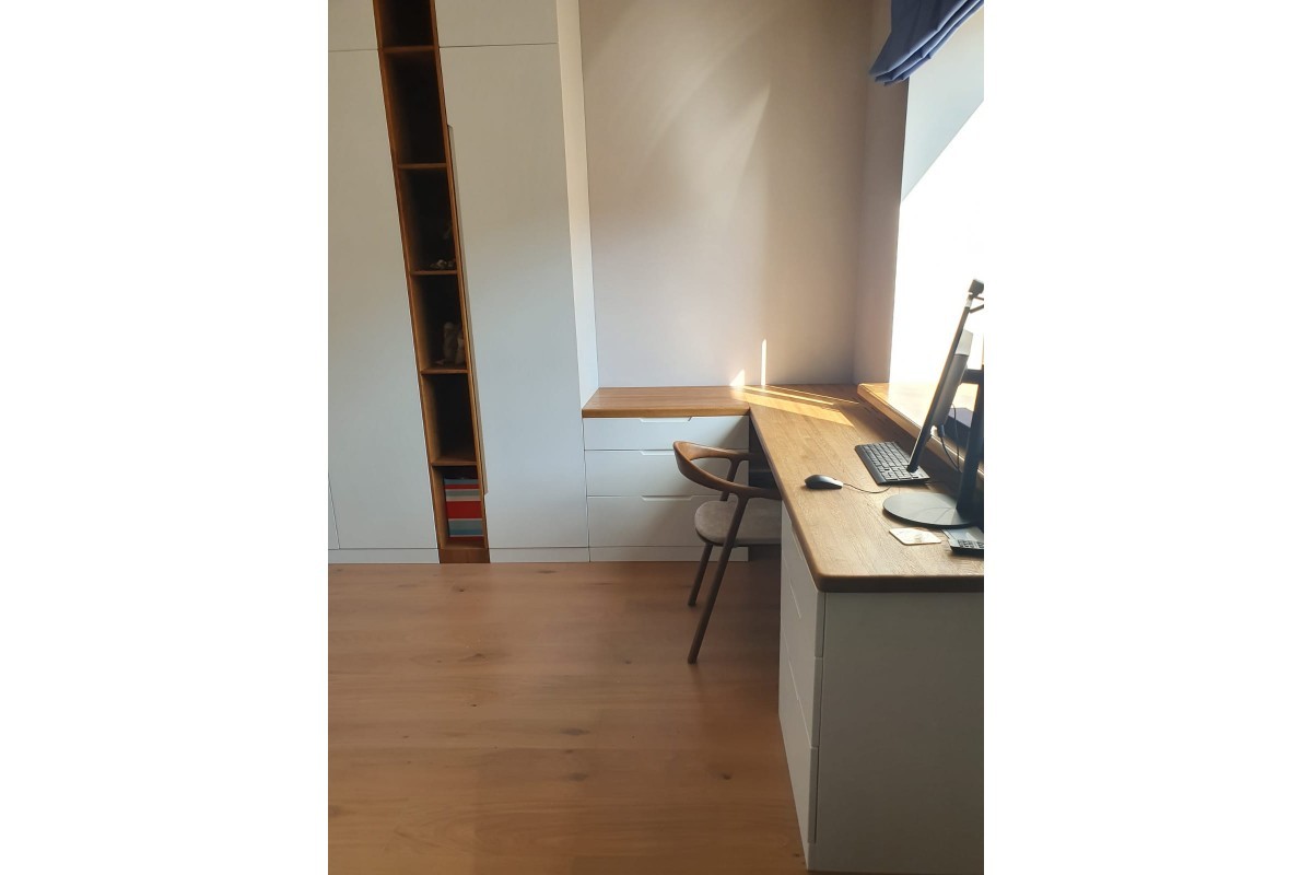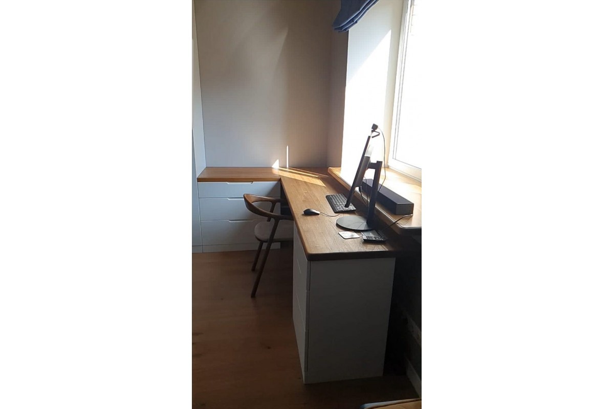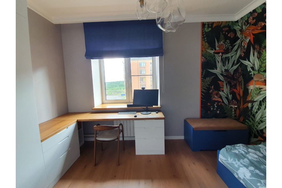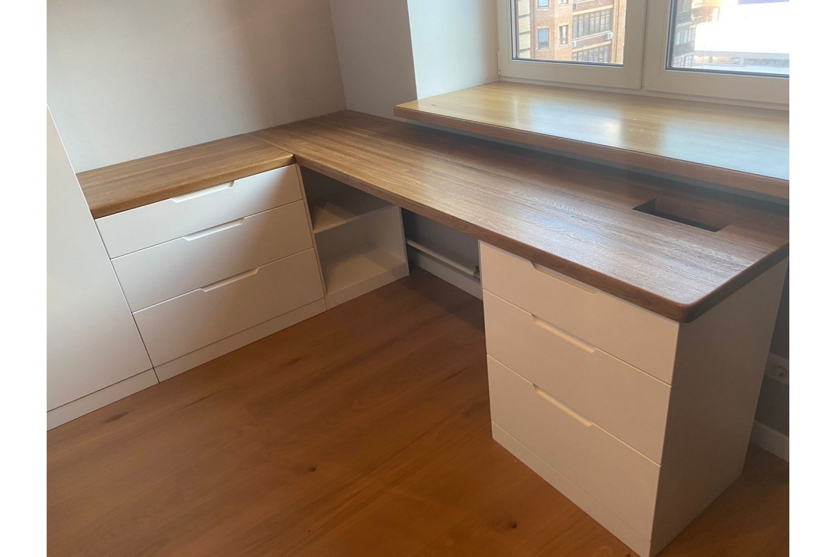 Большой письменный это мечта каждого ученика, а если он расположился возле окна, то вообще идеально и полезно для глаз. Стол выполнен из массива дуба, всем известно, что это материал на века. Что отличает этот стол от многих других? Цветовое решение, ведь сочетание белого глянца и натурального дерева это всегда стильно и практично, потому что впишется в любой интерьер.