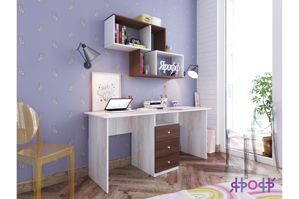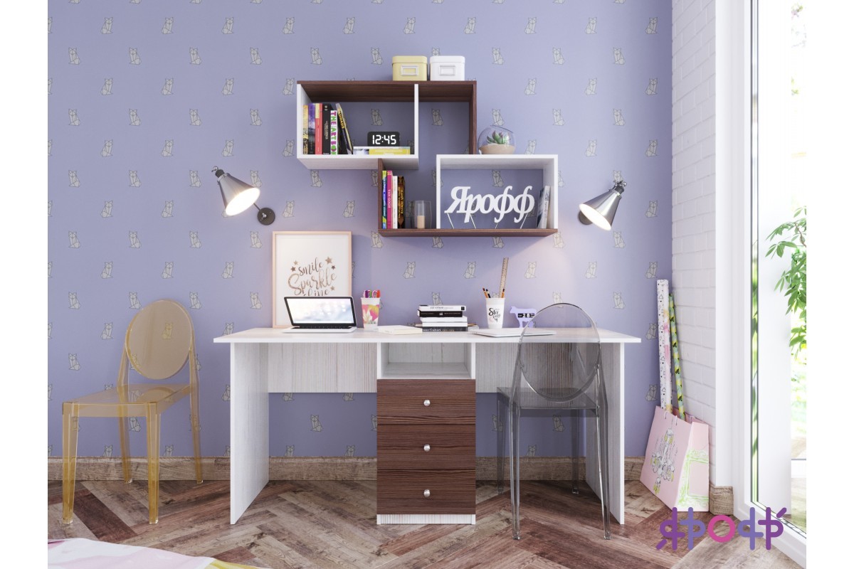 Двухместный стол имеет оптимальную форму и размер, чтобы разместить его вдоль стены в любом месте комнаты, у него большая рабочая поверхность, на которой легко встанет ноутбук или небольшой компьютер. Вы можете выбрать подходящие именно вам цветовое оформление каркаса и фасада двухместного стола для детской комнаты, в частности, чтобы он подходил под остальной комплект модульной мебели или ваш интерьер.