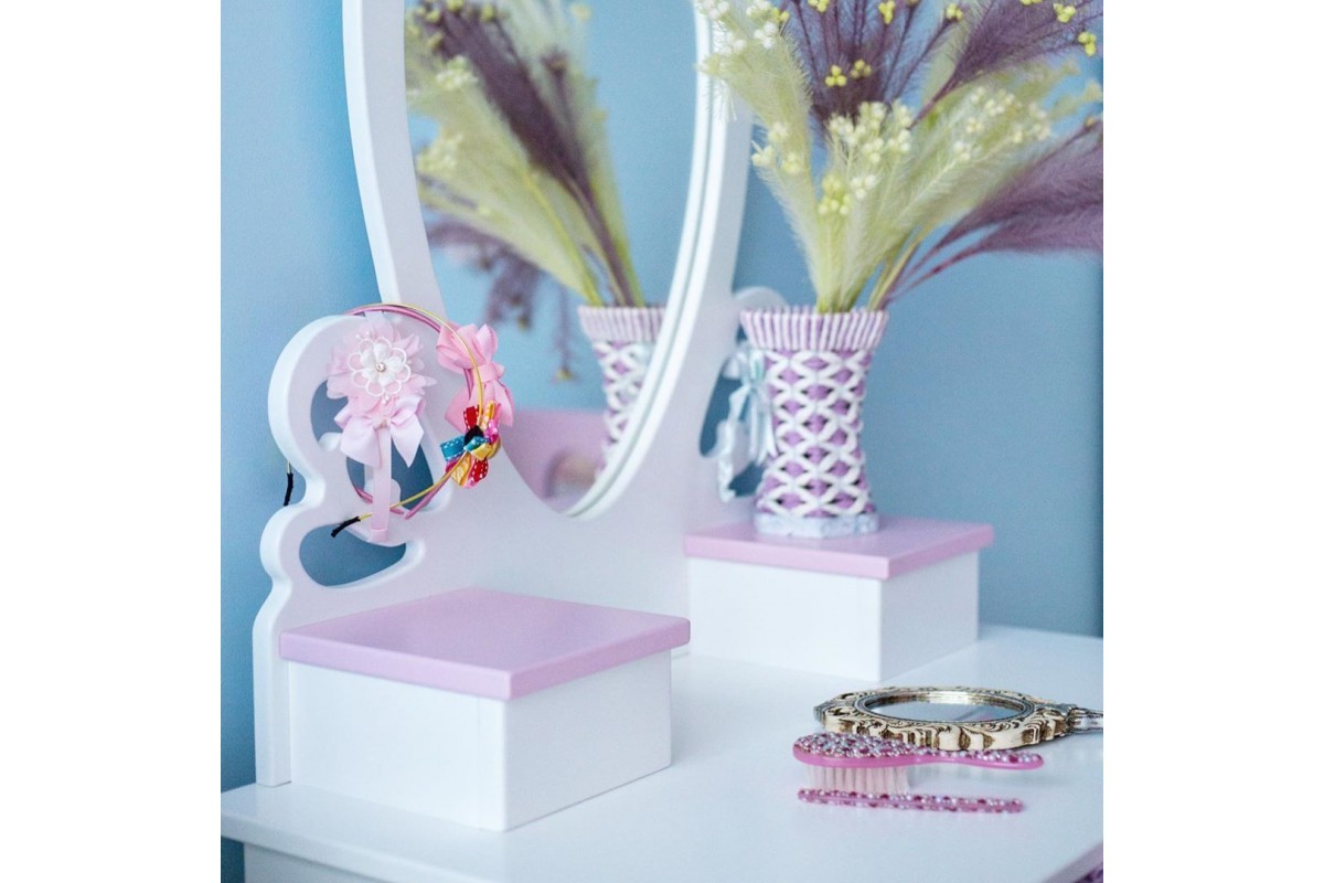 Детский туалетный столик – идеальный предмет детской мебели, который позволит хранить в одном месте все аксессуары вашей маленькой леди: украшения, расчески, банты и многое другое. Туалетный столик «Сердечко» станет украшением детской комнаты. Маленькие леди смогут весело играть, наряжаться, делать себе прически, пробовать краситься, готовясь к новому дню.