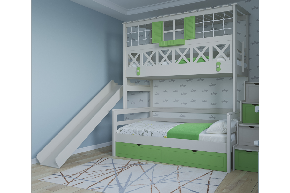 Верхний ярус кровати оснащен открываемой панелью для удобства смены белья. Под нижним ярусом расположились два выкатных ящика для хранения.