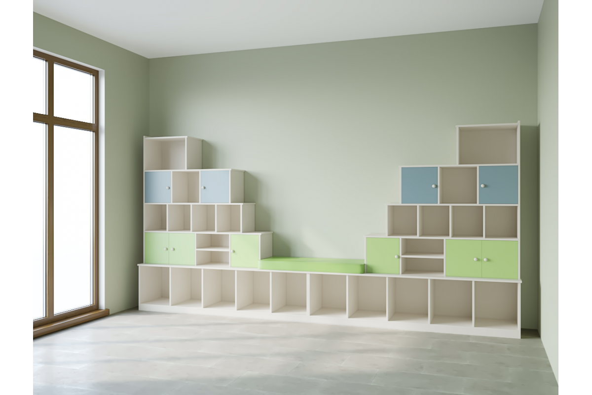 Для хранения игрушек пригодится навесная полка и большой стеллаж, который с лёгкостью разместит в себе все необходимое. Для завершения гармоничного интерьера игровой комнаты советуем поставить детский столик и стульчик.