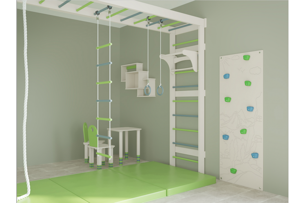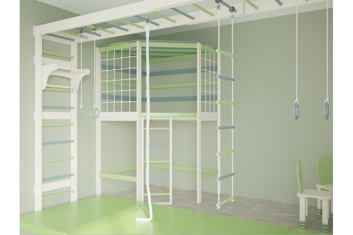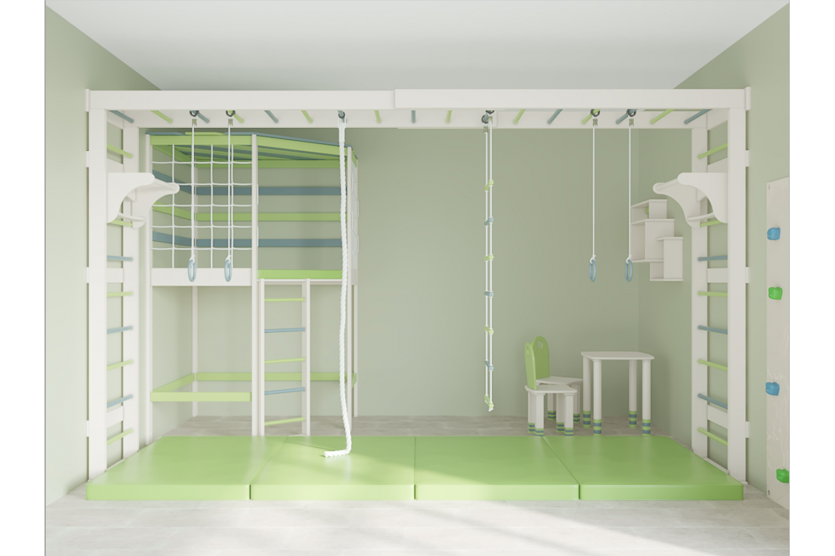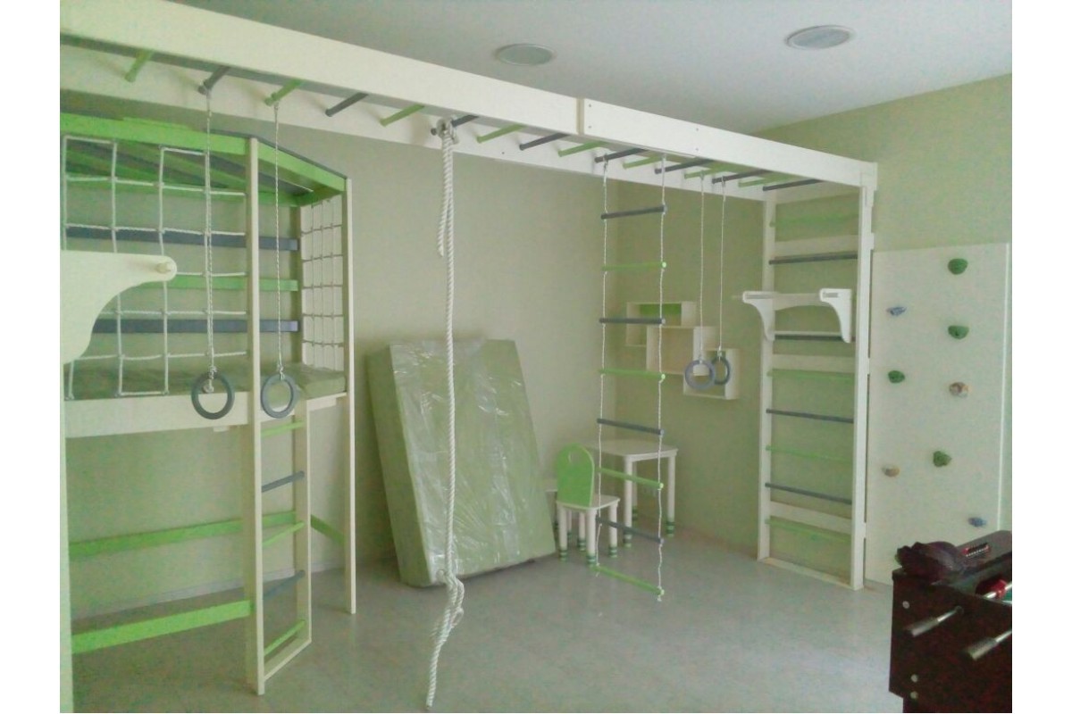 П образный спорткомплекс, включающий в себя все необходимые спортивные снаряды - самая важная часть для физического развития ребенка. Навесные элементы стоит выбирать в соответствие с интересами ребенка (Цена комплекса указана без учета навесных элементов). Полоса препятствия завершается скалодромом. Мечта практически каждого ребенка.