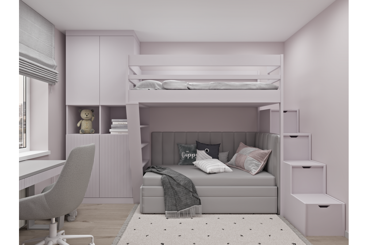 Классическая кровать чердак с лестницей комодом отвечает за здоровый и крепкий сон. Лестница заменит полноценный комод и позволит использовать пространство максимально полезно. Под кроватью расположена мягкая софа с выкатным ящиком для постельного или сезонных вещей. Софа может служить, как зоной отдыха, так и дополнительным спальным местом.