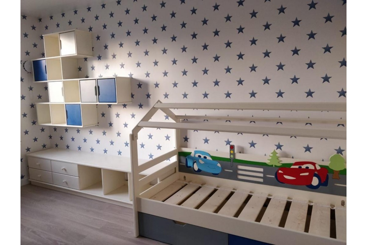 Первостепенную роль занимает кровать низкий домик, она позаботится о здоровом и комфортном сне малыша. Кровать компактная, оснащена крышей из которой малыш сможет сделать шалаш. В нижней части расположены два выкатных ящика для хранения. Фигурный бортик в форме яркой машинки порадует малыша и он с удовольствием будет рассматривать его перед сном. ВЫ можете заказать бортик с другими элементами декора на Ваш вкус.