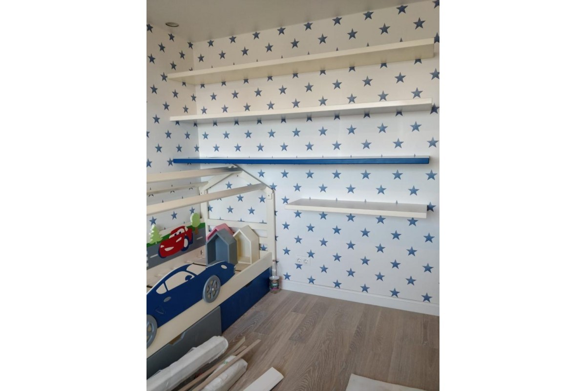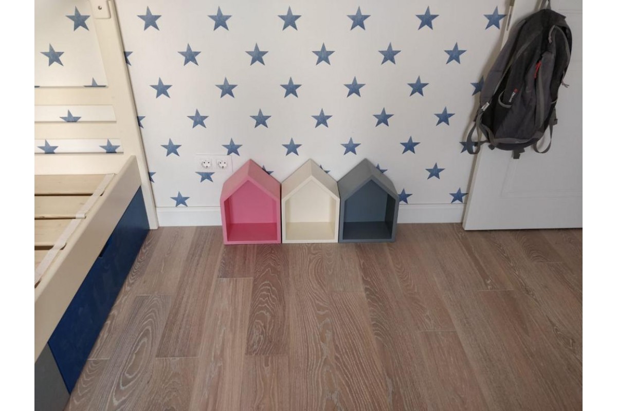 Воздушные полки, разместят на себе всю коллекцию машинок или фигурок, не утяжеляя интерьер. А уютная полка домик станет прекрасным местом для книг и добавит детской нежности интерьеру.