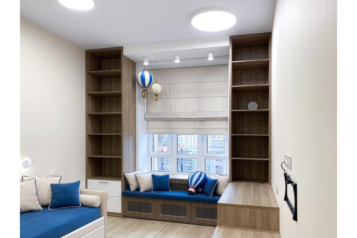 Дополнительной зоной релакса оформлен подоконник. Мягкая обивка цвета дивана и панели с декоративными решетками в цвет стеллажей добавляют уюта и желания присесть на него с книгой или планшетом для рисования.
