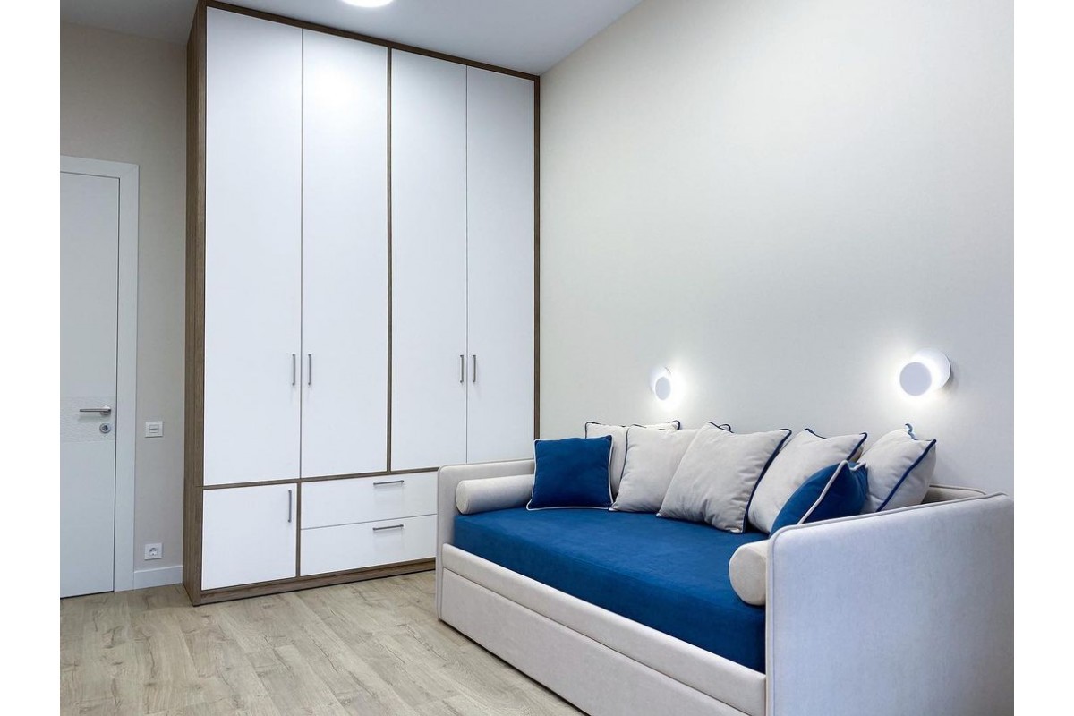 Комната выполнена в сочетании молочного и благородного синего оттенка с мебелью в цвете натурального темного дерева.