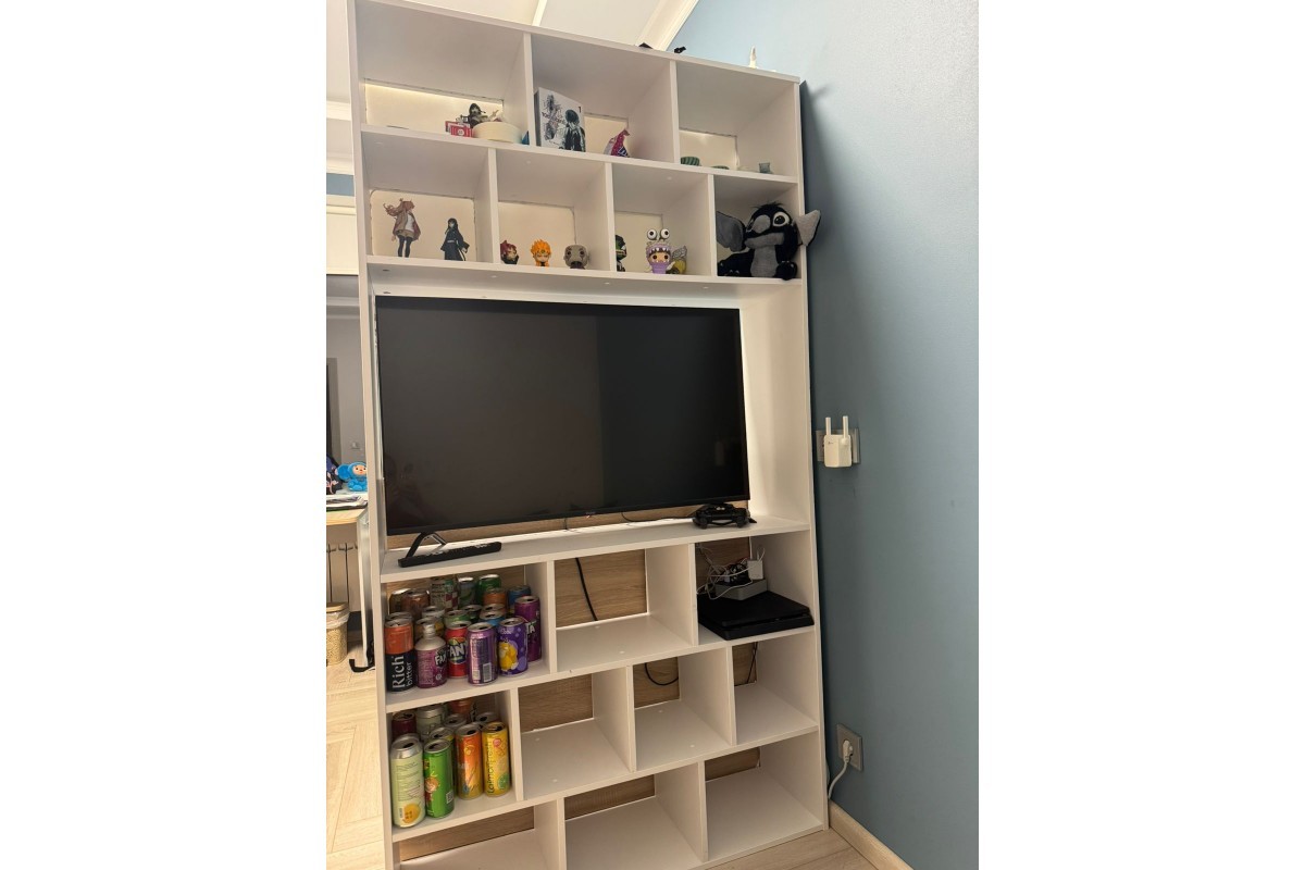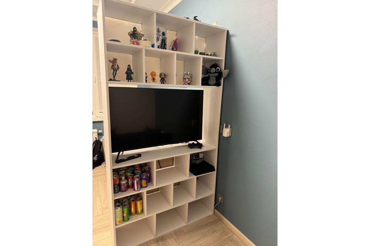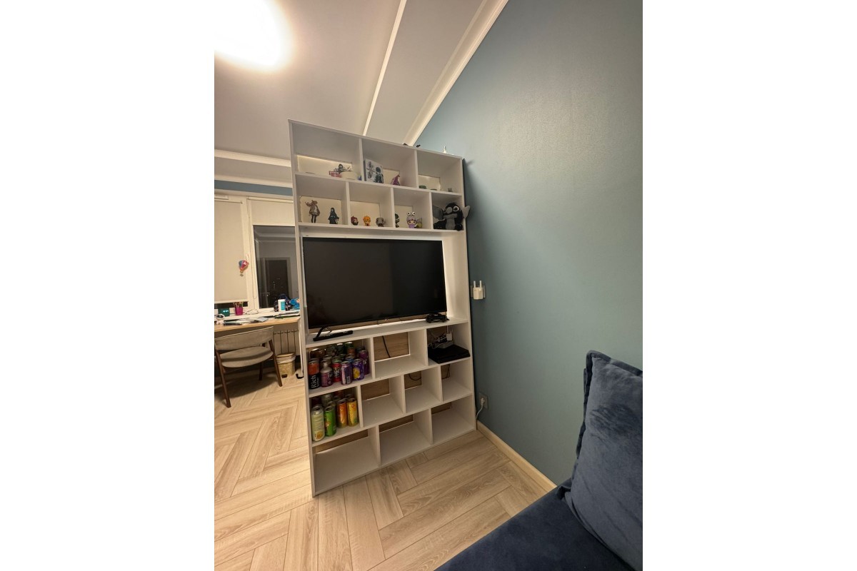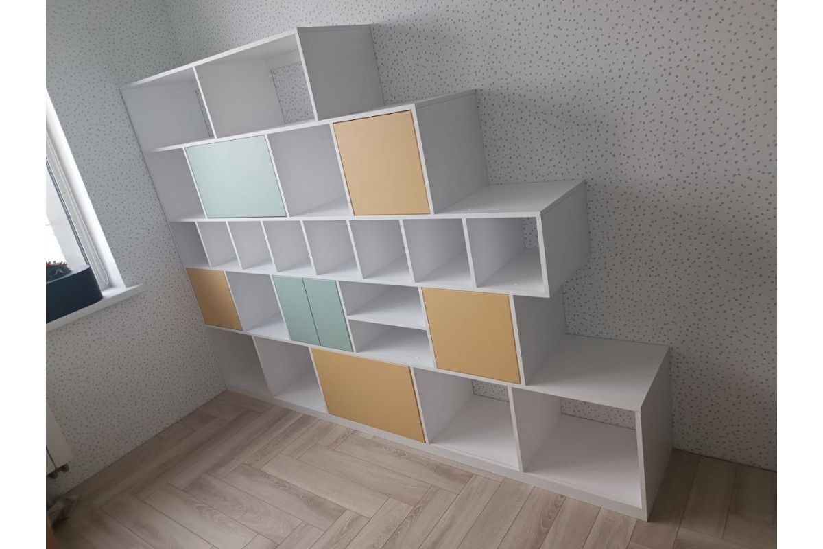 Главное преимущество стеллажа - возможность зонировать пространство. Отделить спальную зону от рабочей или разделить кровати двух детей. Этот стеллаж выполнен горкой, что позволяет размещать и на верхней полке вещи, а еще оснащен закрытыми полочками, что очень удобно для организации хранения.