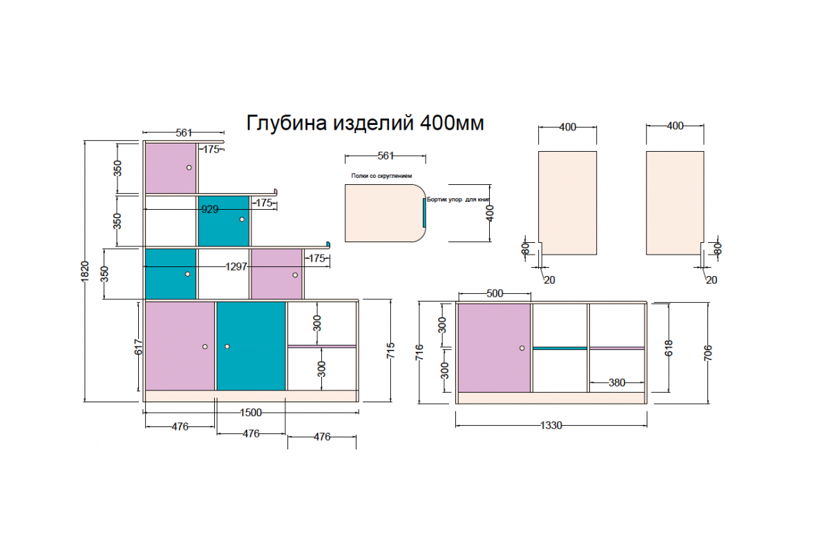 - Стеллаж, полки со скруглением, бортик - упор для книг;