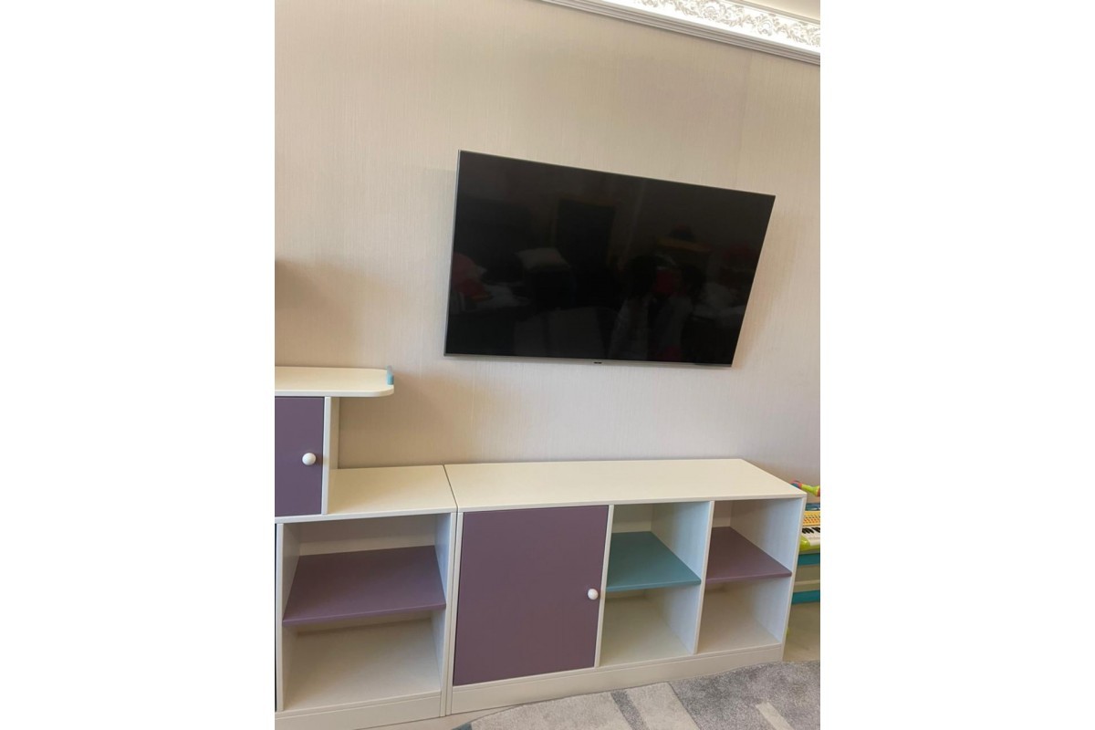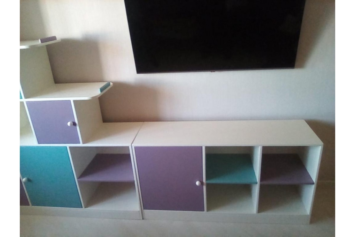 Также необходимый элемент мебели в детской комнате - тумба под телевизор, ведь дети так любят смотреть мультики! Компактная удобной формы тумбочка выдержит не только телевизор, но и позволяет хранить на полках личные вещи.