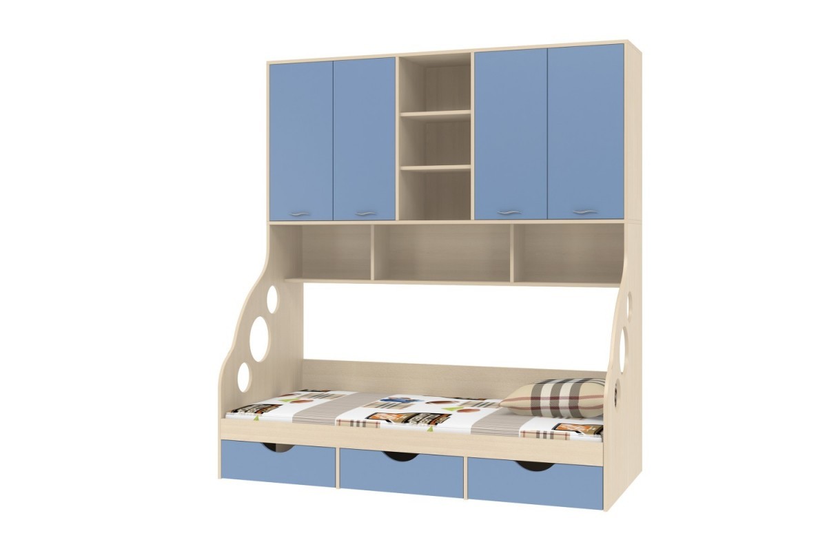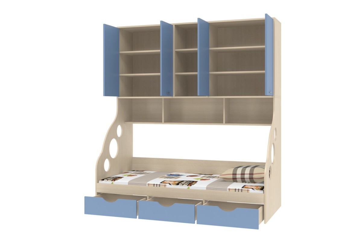 Кровать с антресолью Дельта - 21.11 представляет собой функциональный комплекс, совмещающий в себе расширенное спальное место с блоком вместительных антресолей, удобных для хранения книг, предметов декора, игрушек и других личных вещей. Антресоль состоит из трех открытых и шести закрытых за распашными дверями ниш. Внизу расположены три выкатных ящика, в которых можно хранить постельное белье или одежду. Этот комплекс можно успешно скомплектовать с другими подходящими элементами корпусной мебели серии Дельта.