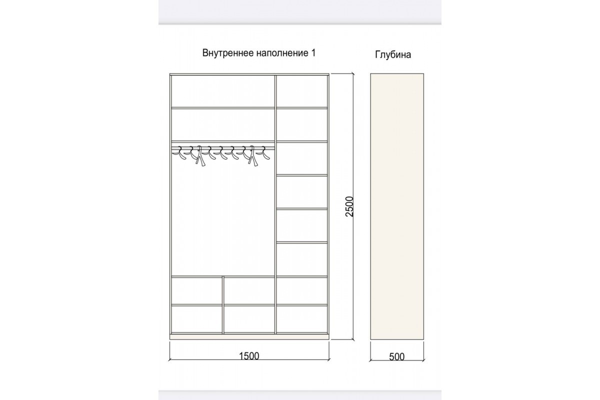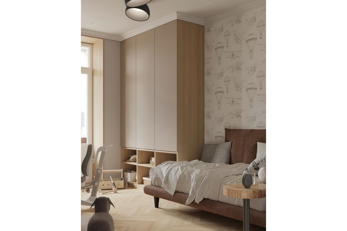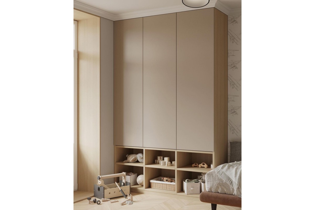 Три широких створки за которыми скрывается целый мир порядка и организованности. Внутреннее наполнение можно выбрать, как в предложенном варианте или сделать по индивидуальному заказу. Высота шкафа выполняется под потолок и это прекрасно, ведь полезное пространство использовано полностью, и никакого скопления пыли на неудобной для уборки верхней крышки шкафа. В нижней части расположен открытый стеллаж в котором будет удобно хранить игрушки, книги или любые мелкие предметы в стильных органайзерах.