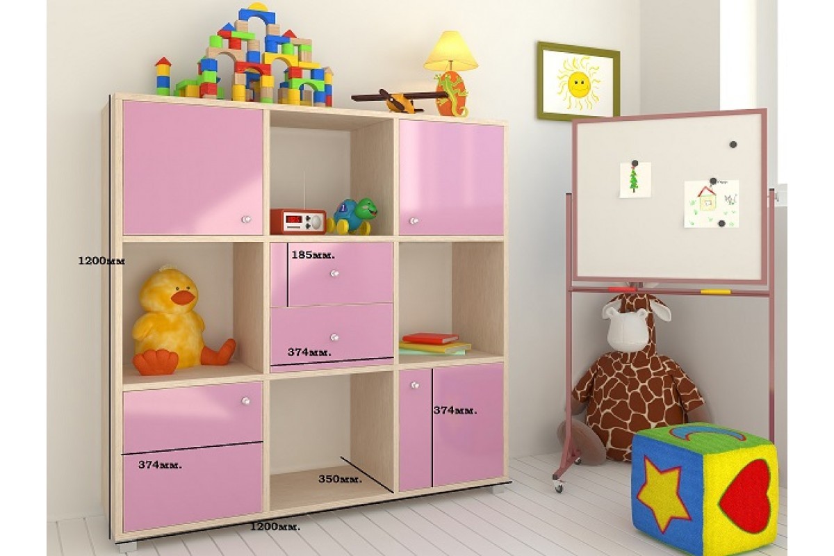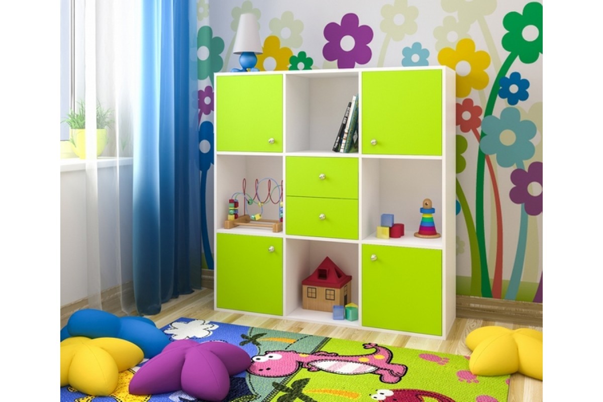 Экспериментируйте с количеством дверей и сочетанием цветов,чтобы получить неповторимый стеллаж, который займет достойное место в вашейдетской.