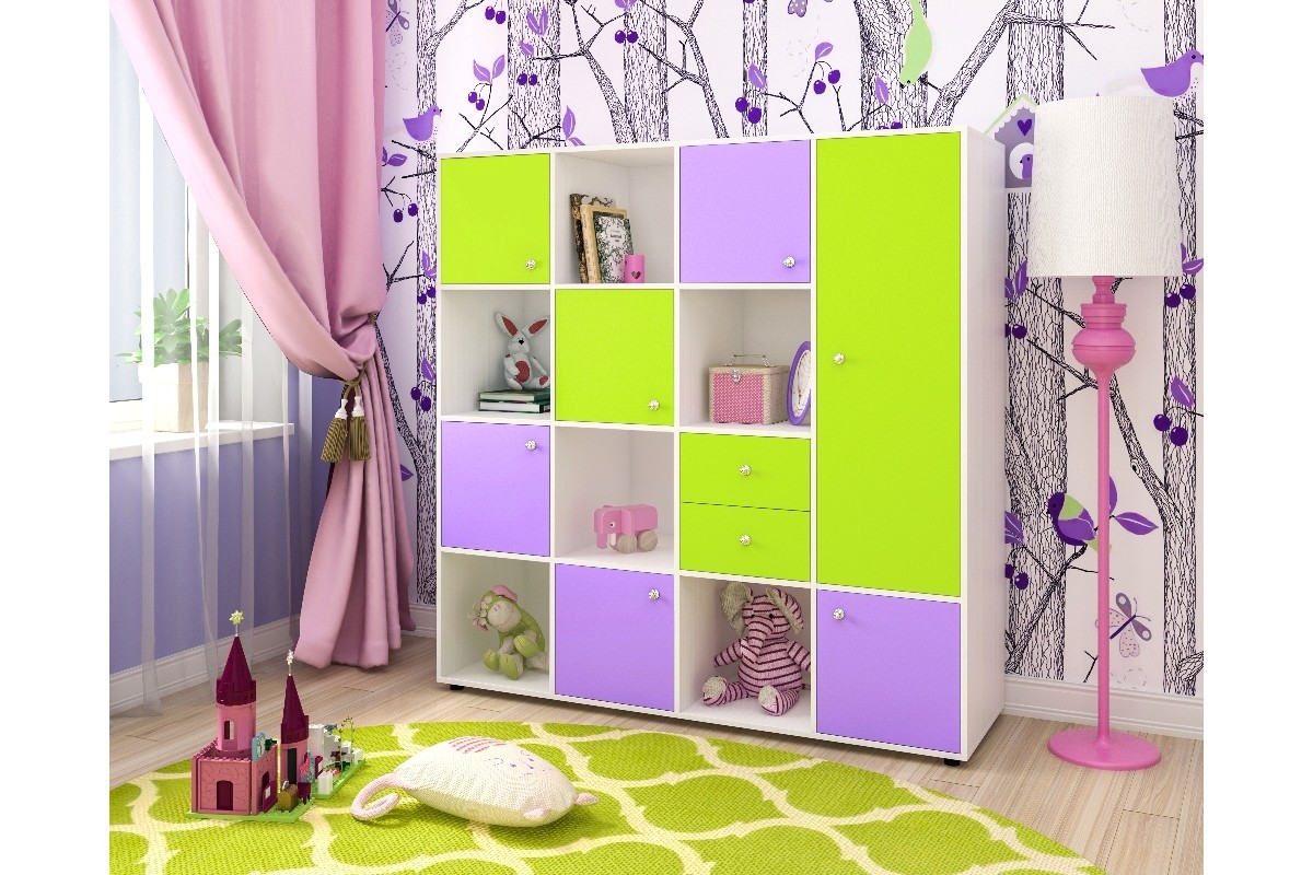 Цвет корпуса: дуб молочный, белое дерево.Цвет фасада: Лайм/Оранжевый, Ирис/Розовый