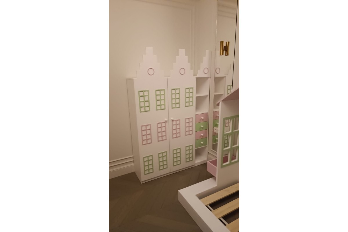 Шкаф в виде домика с несколькими крышами отлично поддерживает, выбранный стиль комнаты и прекрасно справится с задачей - организации хранения, ведь внутреннее наполнение продумано до мелочей.