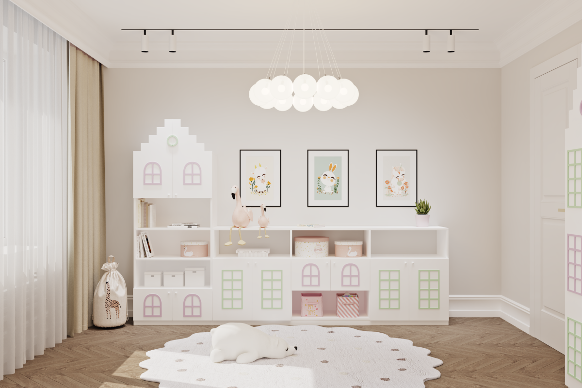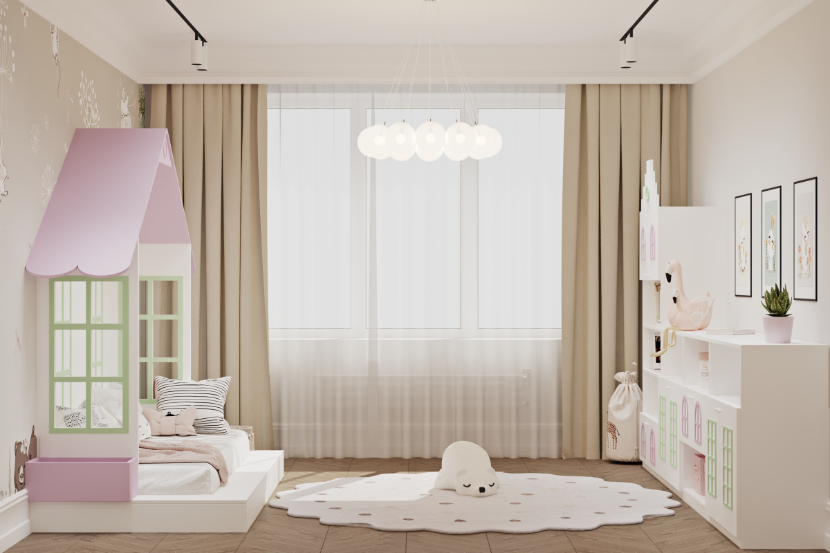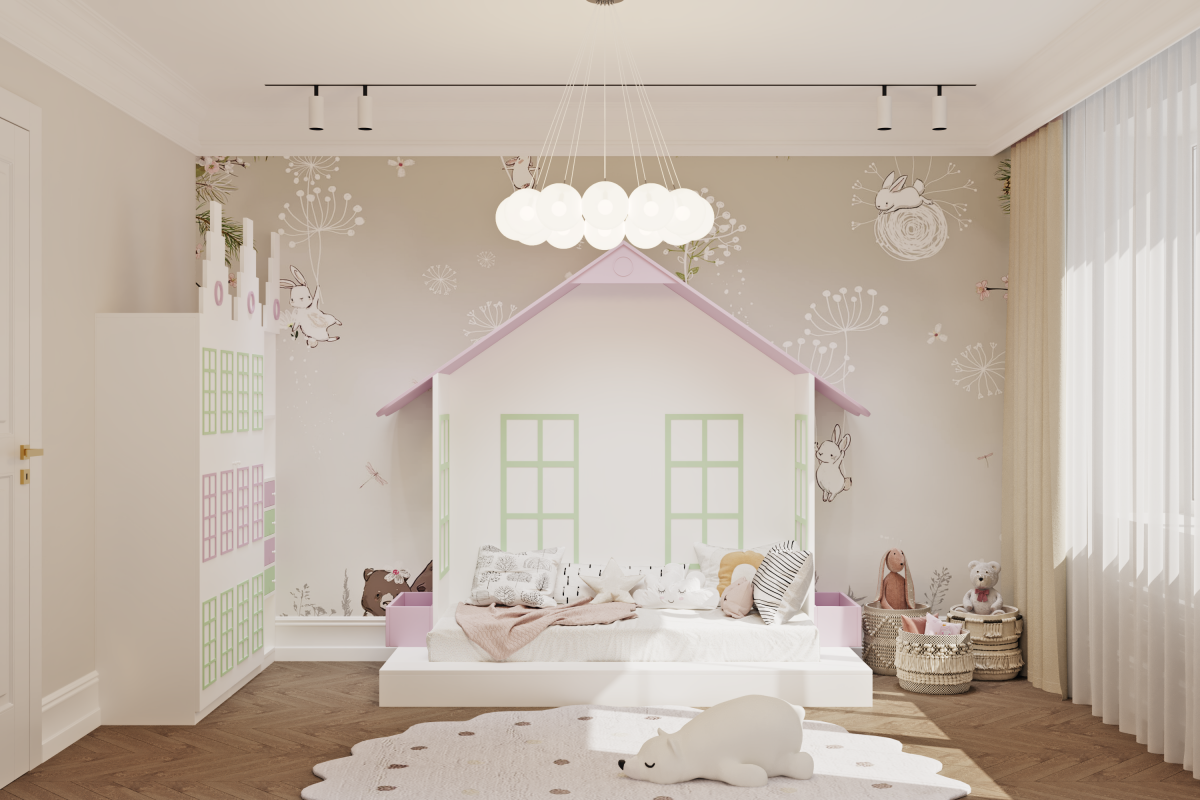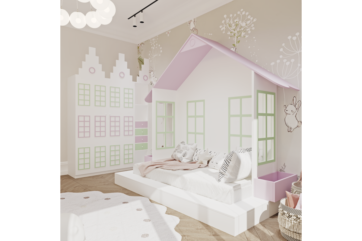 Эта комната - настоящее маленькое царство для принцессы. Кровать - домик прекрасно выделяет зону отдыха, защищая от лишних солнечных лучей во время дневного сна, за счет напольного размещения даже ползающий малыш на нее заберется самостоятельно. А милые боковые ящики помогут разместить любимые книги под рукой.